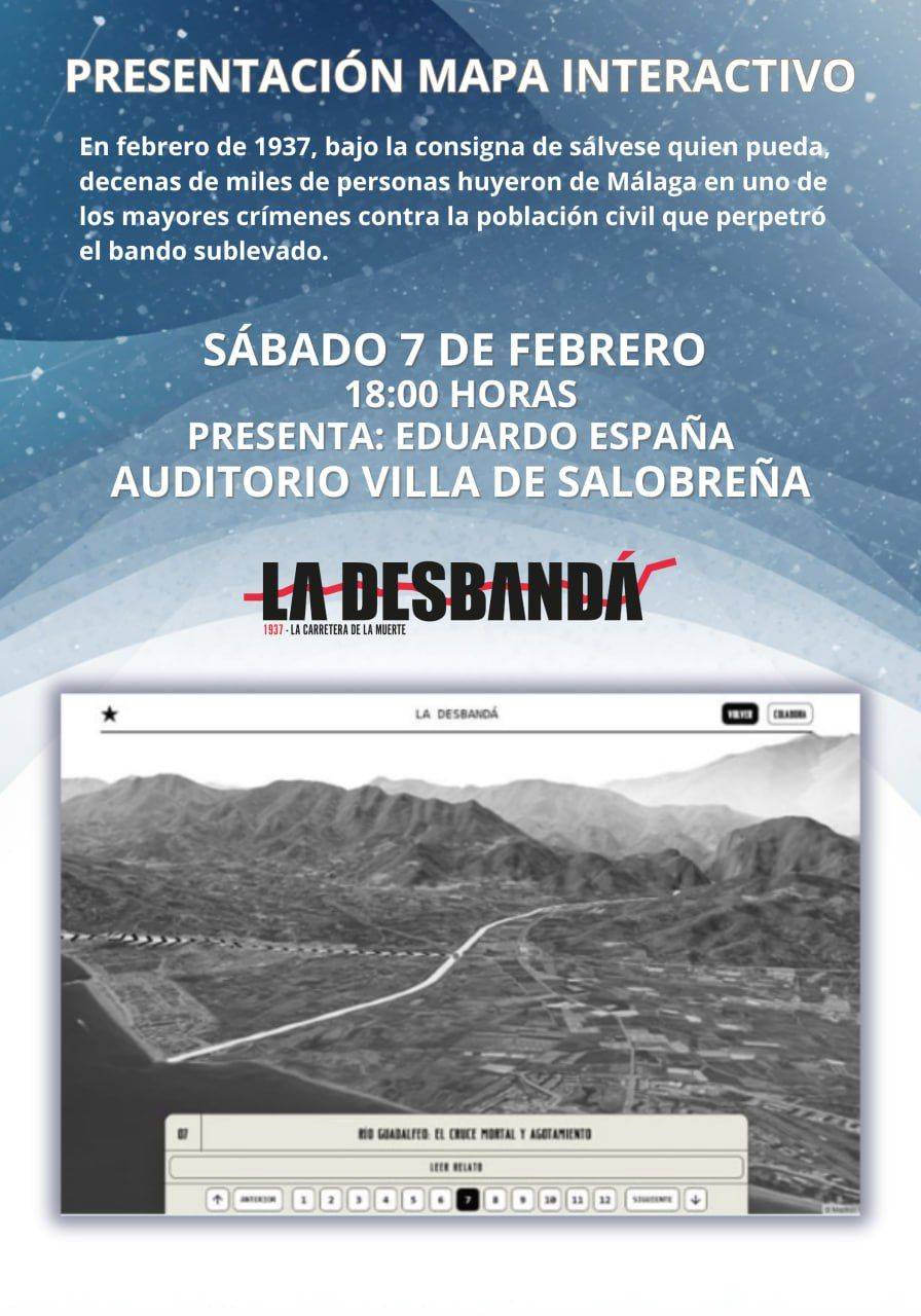 El sábado día 7, a las 18 horas, tendrá lugar la presentación del mapa interactivo ‘Recorre La Desbandá’, una herramienta digital en forma de web que permite recorrer de forma virtual el itinerario del éxodo de la población civil a través de fotografías, documentos históricos y testimonios. Entrevista con Eduardo España, representante de la empresa creadora: radiosalobrena.com/audios/mapa-interactivo.la-desbanda.mp3 https://share.google/rPrjjfW38hxfrI2mm